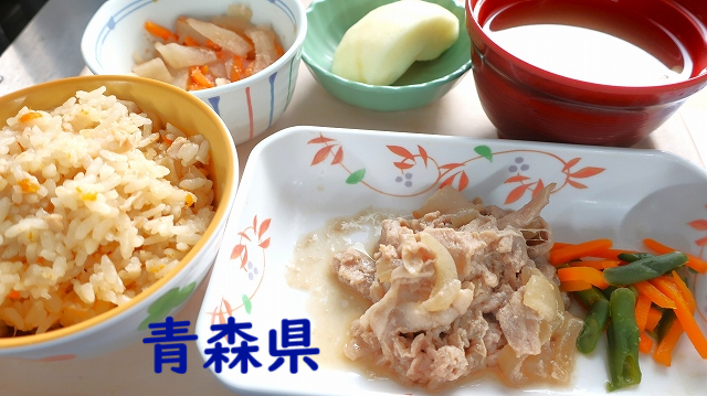 ほたての炊き込みご飯 豚肉のバラ焼き たらの子和え けの汁 りんご